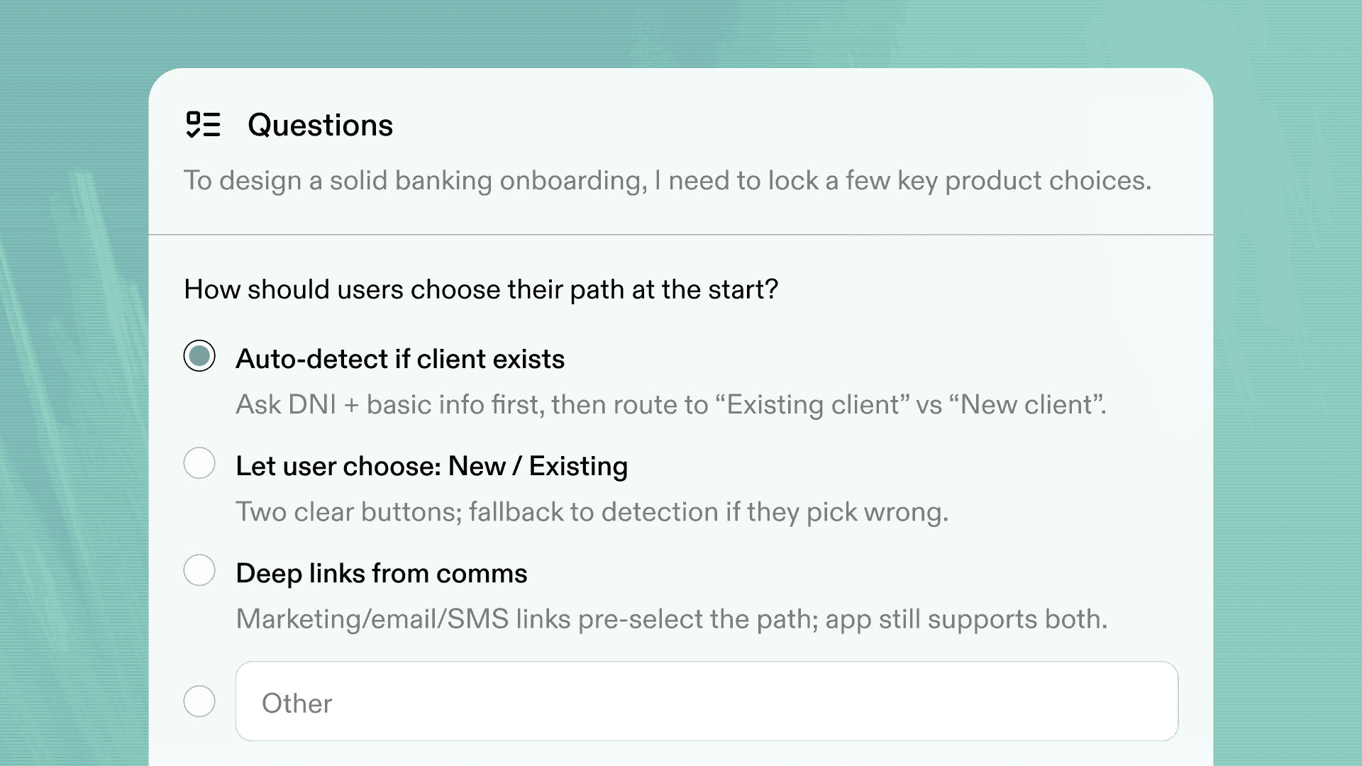 Inline clarifying questions. The agent asks smart, contextual questions through a guided UI that includes radio buttons and checkboxes with brief descriptions to make it easy to think through your options, not just pick one.