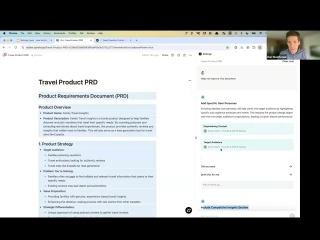 Join Dan, VP of New Products at Reforge, as he walks you through the development and features of the Reforge Extension. In this event recording, you'll learn about the tools, processes, and technical details that went into building this extension. Dan starts with a live demo, showcasing how the extension seamlessly integrates into tools like Google Docs, Notion, Confluence, and Coda to help users write PRDs and other documents efficiently. He discusses the journey from initial concept to refined product, including user feedback loops, software development milestones, and optimization techniques. Additionally, discover the considerations around privacy, cost management, and future roadmap plans. Finally, we conclude with a robust Q&A where Dan fields questions about everything from database management to UI tradeoffs.