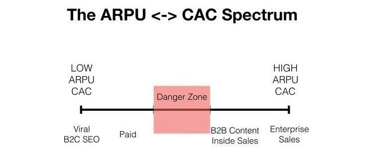 Companies in the danger zone also have ARPUs that are too low to support the higher CAC channels. These companies end up with terrible unit economics as they're forced to shell out more than they can bring in with that spend.