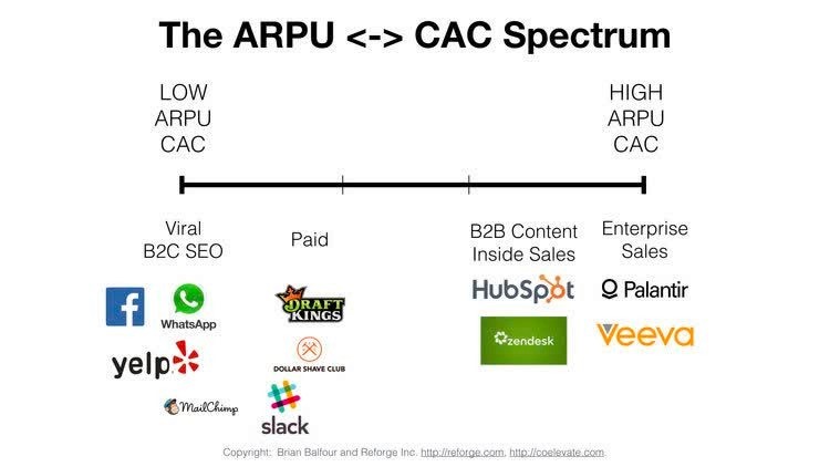 Finally, on the far right-hand end of the spectrum you have very high ARPU businesses (6 to 7 figures) and therefore take advantage of very high CAC channels such as enterprise and outbound sales.