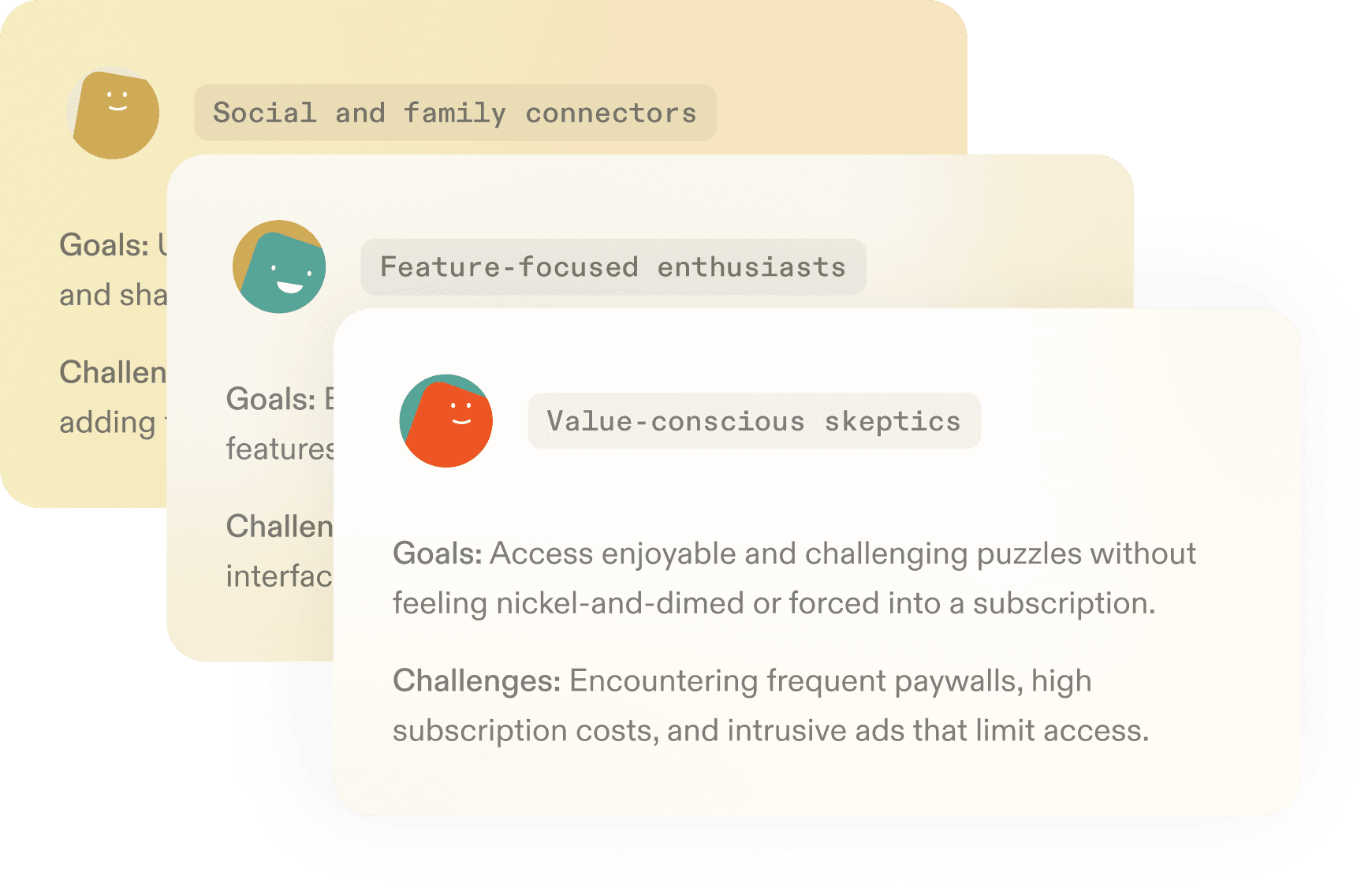 Based on your users, and their goals and challenges, Reforge Insights assembles recommended personas for your surveys.