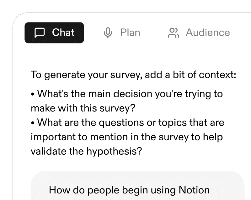 Generate surveys, find the right segment, ask users follow-up questions, and analyze results with AI.